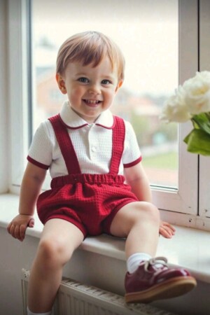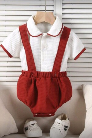 outifit de dos piezas de niño color rojo y blanco con botones de frente y tirantes